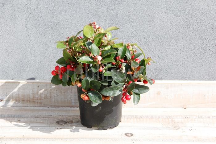 Stálezelená vřesovcovištní rostlina dosahující výšky do 20cm. Listy jsou široce vejčité, tmavě zelené, lesklé a pevné. Květy jsou bílé, zvonečkovité. Nepřehlédnutelná je na podzim, kdy dozrávají velké červené bobule.