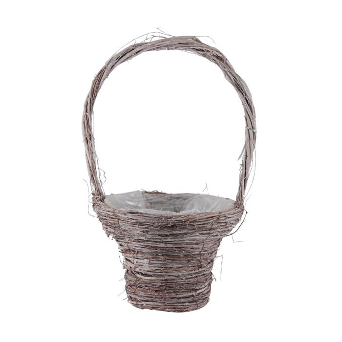 Rustikální kulatý košík z přírodního proutí s pevným uchem a vnitřní igelitovou výstelkou. Praktický i dekorativní doplněk vhodný pro různé účely – od aranžování květin, přes velikonoční dekorace až po balení dárků nebo jako obal na květináč.
