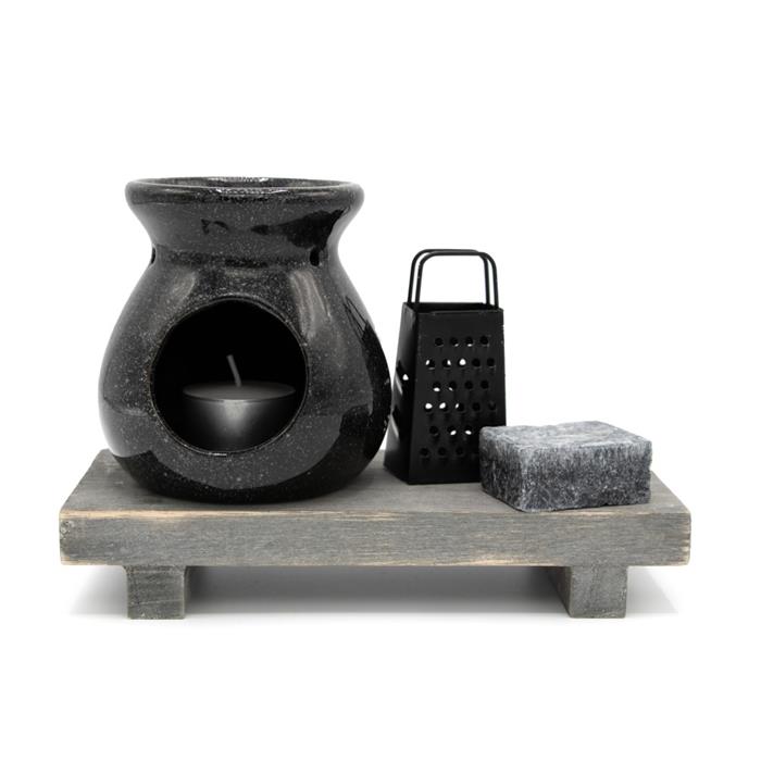 Dárková sada aromalampy, struhadla, prkénka a vonného vosku. Tato elegantní dárková sada VESUVIUS potěší každého milovníka vůní a relaxace. Stylová keramická aromalampa v černé barvě se spolu s vonným voskem postará o příjemnou atmosféru vašeho domova.