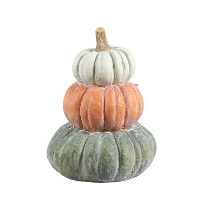 Originální dekorace složená ze tří dýní v jemných podzimních odstínech – zelené, oranžové a krémově bílé. Díky kvalitnímu polyresinovému provedení je dekorace odolná, stabilní a přitom působí velmi realisticky. Skvěle zapadne do podzimní výzdoby a vnese do vašeho domova hřejivou sezónní atmosféru.