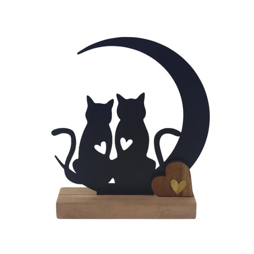 Kočky sedící u měsíce se srdíčky kovové na dřevěném podstavci 16,5cm