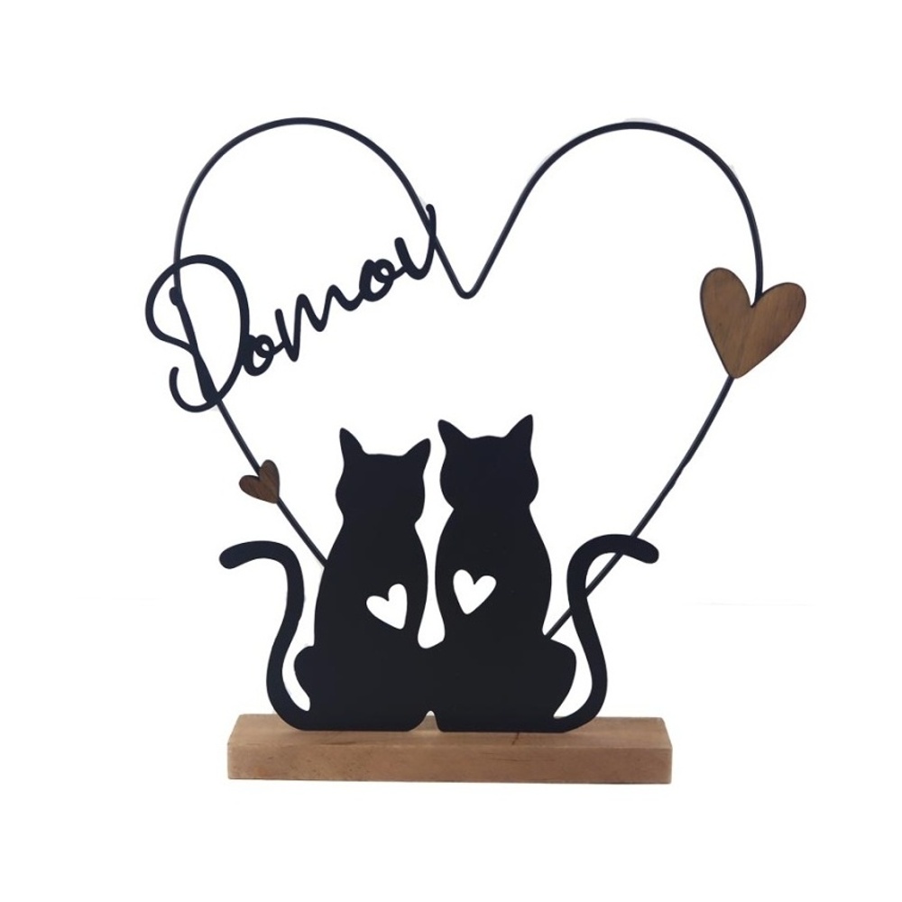 Kočky sedící v srdci DOMOV kovové na dřevěném podstavci 26,5cm