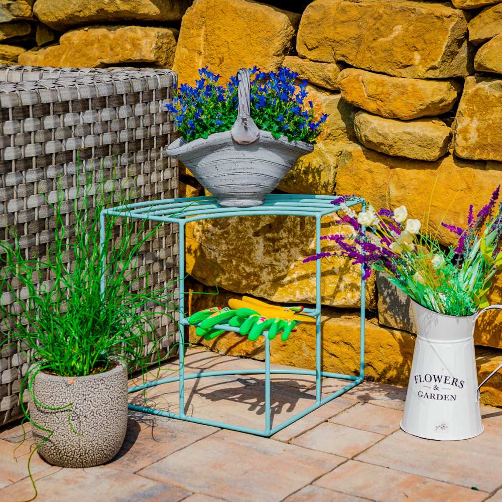 Pevný kovový regál pro rostliny odolný korozi a změnám počasí. Síla tyčí 0,8 cm. Úprava materiálu: před lakováním povrchu probíhá tryskání ocelových broků a automatické odmaštění/fosfátování, poté lakování v práškové lakovně a následně vypalování při cca 200 °C po dobu cca 20 minut. Výsledkem je hladká, antikorozní barva a celoroční užívání na zahradě.
