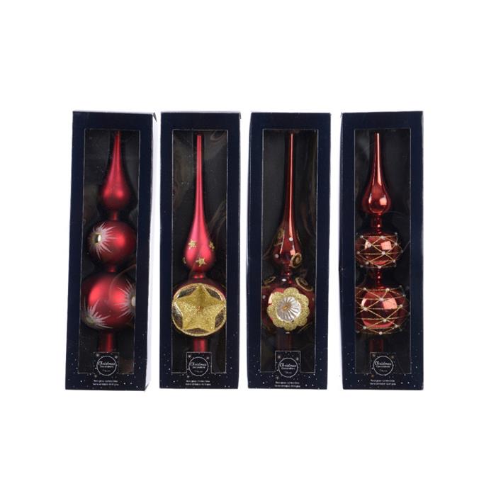 Elegantní skleněná špička ve vínové barvě krásně doplní vršek vánočního stromku a dodá mu jemný, slavnostní vzhled. Klasický tvar a decentní povrchová úprava se hodí ke všem stylům zdobení – od tradičního po moderní. Špička v mixu provedení. Pokud si přejete konkrétní variantu, napište ji do poznámky, pokusíme se vyhovět. V případě nedostupnosti bude odeslán náhodný kus.