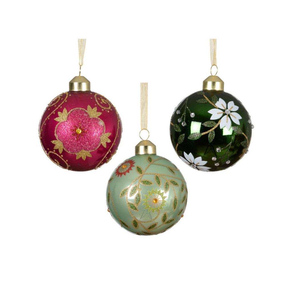 Jemná a elegantní ozdoba, která potěší milovníky přírodních motivů. Tato 8cm skleněná koule dodá vašemu stromečku svěží vzhled. Zdobí ji motiv květů a je k dispozici v mixu růžové a zelené barvě se třpytkami. Ozdoba v mixu provedení. Pokud si přejete konkrétní variantu, napište ji do poznámky, pokusíme se vyhovět. V případě nedostupnosti bude odeslán náhodný kus.