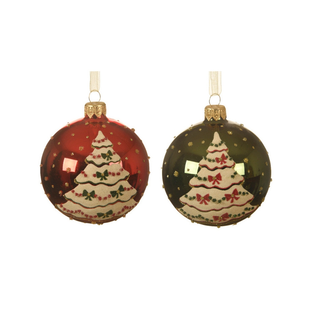 Ozdoba skleněná koule se stromkem a glitry červená/zelená mix 8cm