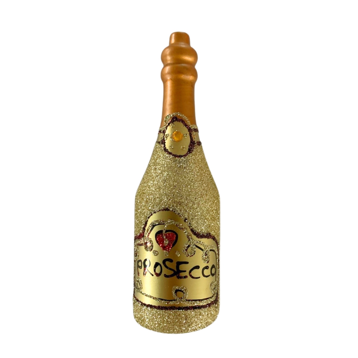 Skleněná vánoční ozdoba ve tvaru lahve PROSECCO v elegantní zlaté barvě vnese do vašeho stromku slavnostní a sofistikovanou atmosféru. Perfektní pro milovníky originálních dekorací.