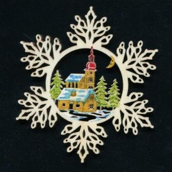 Půvabná dřevěná vločka s motivem kostela je ideální dekorací pro vánoční výzdobu. Precizně vyřezávaný design v přírodním dřevěném provedení dodává dekoraci tradiční a útulný vzhled, který se hodí do stolních aranžmá, věnců nebo jako samostatný dekorativní doplněk.