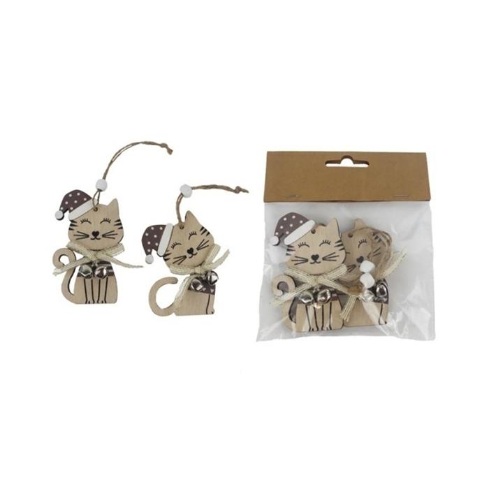 Ozdoba kočka s čepicí a rolničkami dřevěná hnědo-přírodní 2ks