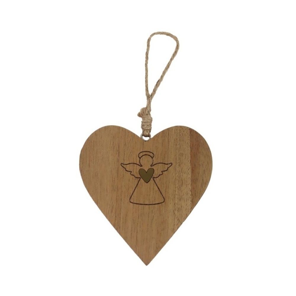 Něžná a symbolická dřevěná ozdoba ve tvaru srdce, zdobená motivem anděla držícího srdce. Tato dekorace v přírodním stylu přináší do vašeho domova pocit klidu, lásky a ochrany.