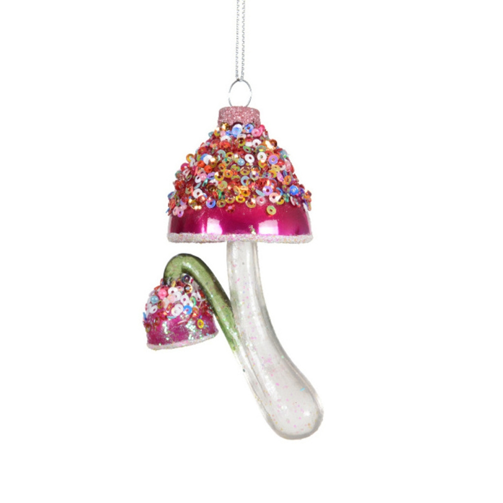Přidejte do své vánoční výzdoby jemný a elegantní lesk s touto skleněnou ozdobou ve tvaru houby, zdobenou třpytivými flitry v něžné růžovo-čiré kombinaci. Tato skleněná dekorace dodá vašemu stromku styl a originální šmrnc.