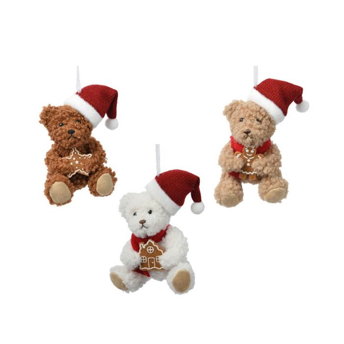 Ozdoba plyšový medvěd s vánoční čepicí bílý/hnědý mix 12cm