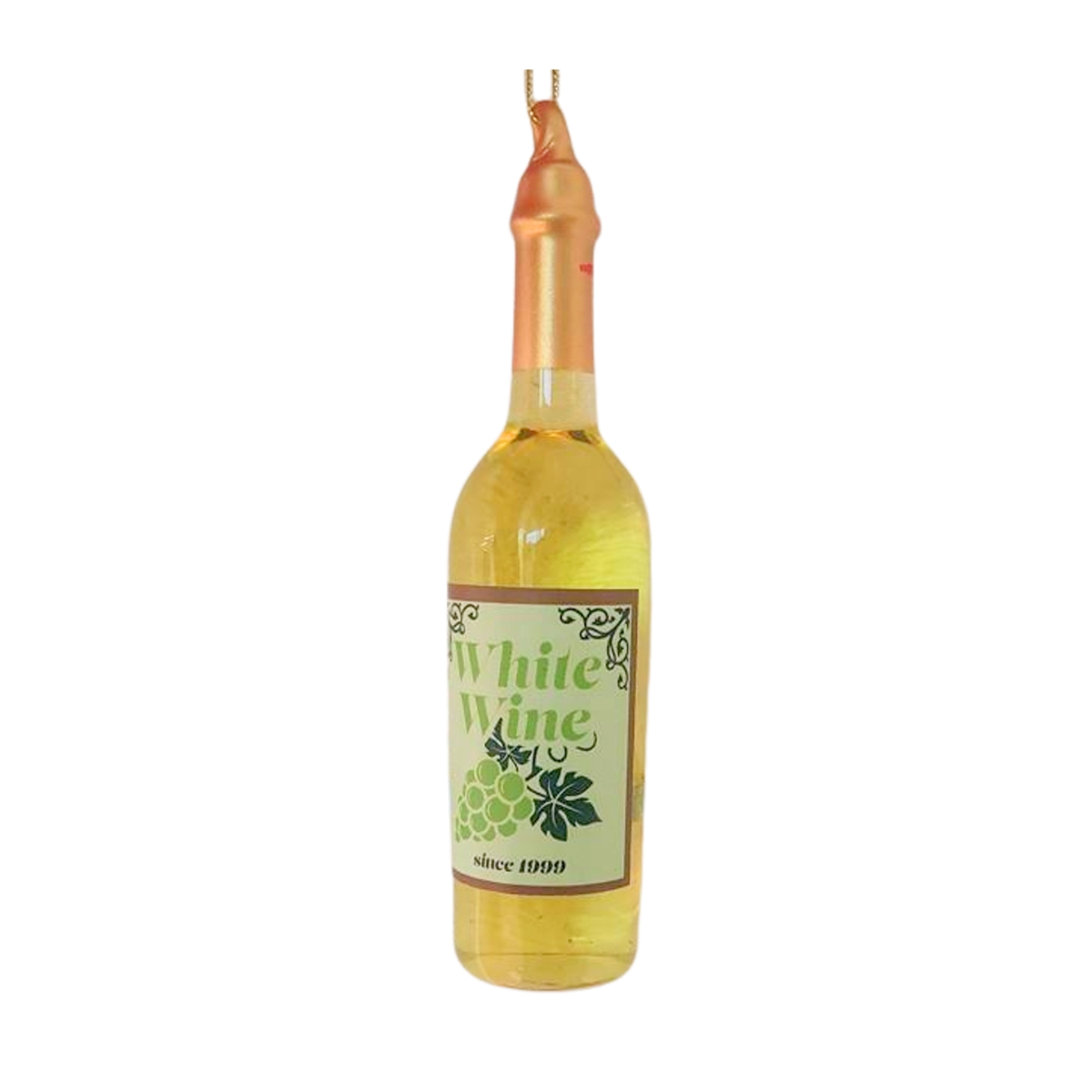 Skleněná ozdoba ve tvaru lahve bílého vína přináší do vaší vánoční výzdoby nádech a originality. Precizně zpracované detaily a jemné barevné akcenty zajišťují, že dekorace zaujme na stromku i v dekoraci.