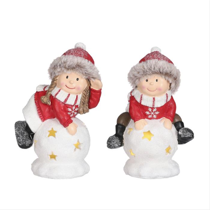 Roztomilá postavička chlapce nebo dívky sedící na svíticí sněhové kouli vytvoří příjemnou sváteční atmosféru v každém interiéru. Koule má drobné výřezy ve tvaru hvězdiček, kterými po rozsvícení jemně prosvítá teplé světlo. Ideální na poličku, stůl nebo jako milý dárek.