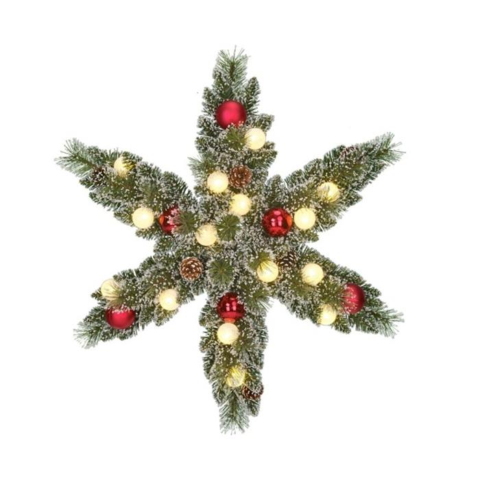 Přineste do svého domova kouzlo Vánoc s touto krásnou umělou vánoční hvězdou KAPRUN. Dekorace je tvořena hustými větvemi připomínajícími čerstvý zasněžený jehličnan, které jsou ozdobeny elegantními červenými ozdobami, šiškami a teplými bílými LED světly.