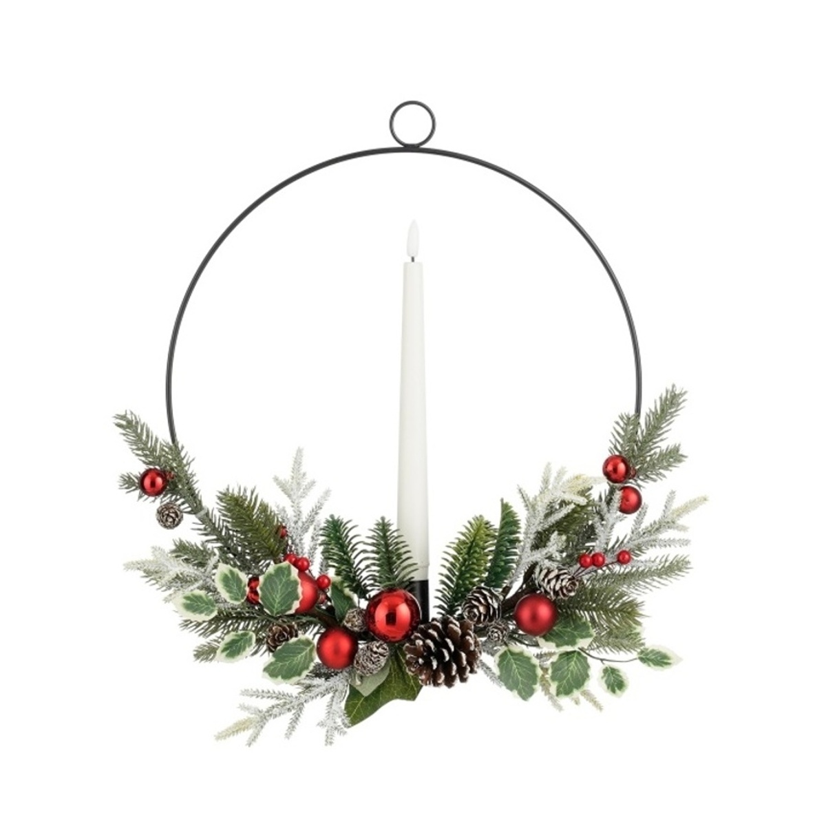Vneste do svého domova kouzlo Vánoc s tímto elegantním svícnem v moderním kruhovém designu. Kombinace umělého jehličí, zasněžených šišek, červených ozdob a teplé bílé LED svíčky vytvoří dokonalou sváteční atmosféru bez nepořádku a rizika otevřeného ohně.