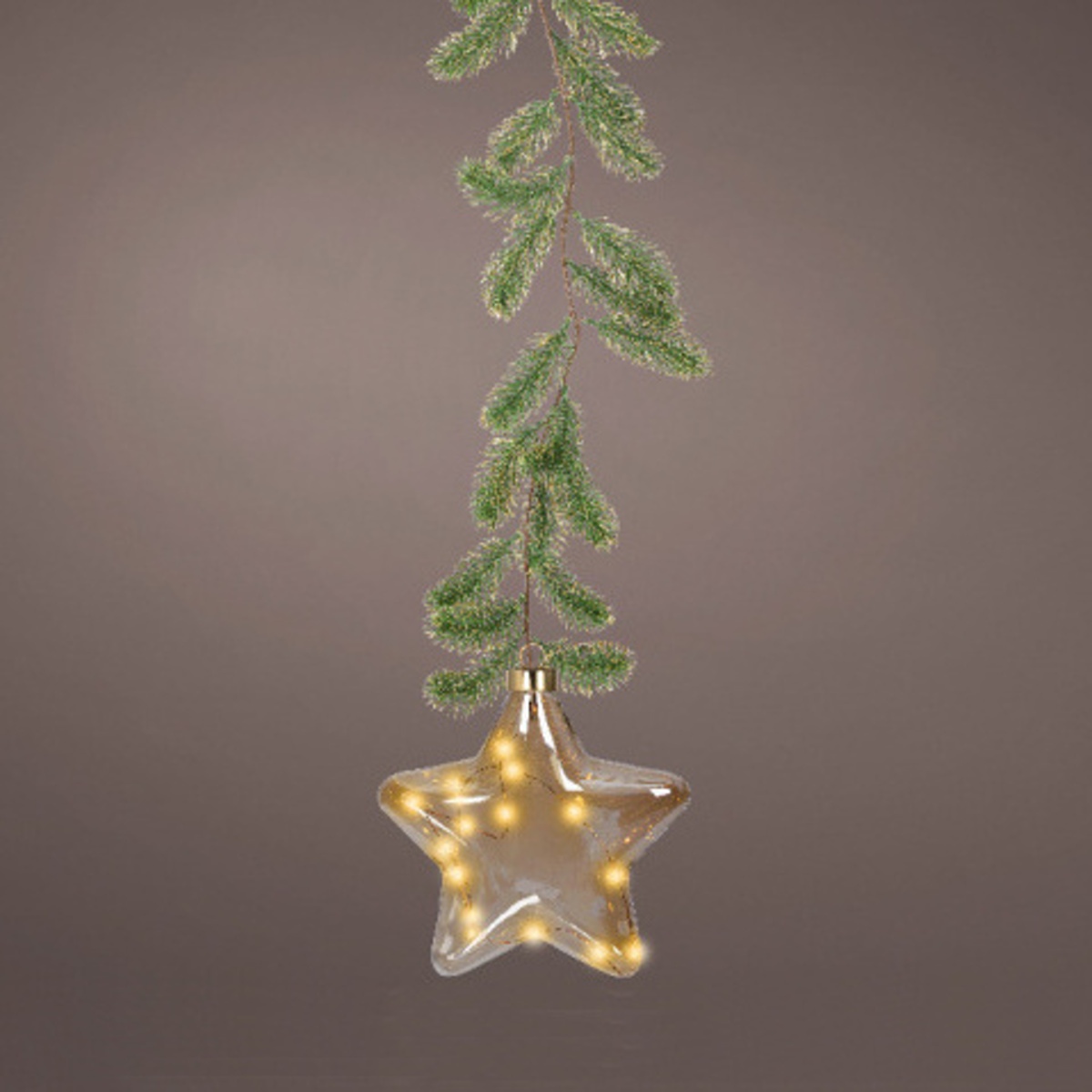 Nádherná skleněná jantarová hvězda ozdobená jemným závěsem z umělého jehličí a vybavená 15 microLED diodami v bílé barvě. Perfektní dekorace, která rozjasní váš domov a přinese do něj zimní kouzlo a vánoční atmosféru.