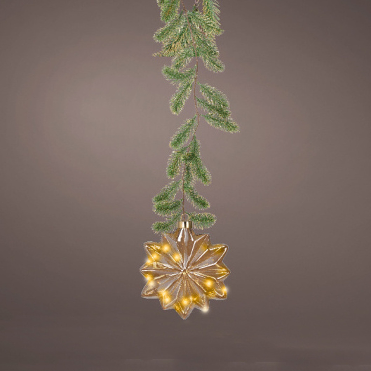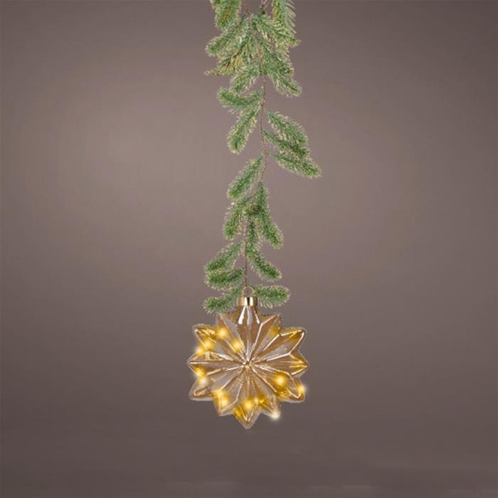 Elegantní a jemná skleněná dekorace ve tvaru květu, která je ozdobená závěsem z umělého jehličí a osvětlená 15 microLED diodami v bílé barvě. Skvělý doplněk pro zimní a vánoční výzdobu, který rozzáří každý prostor.