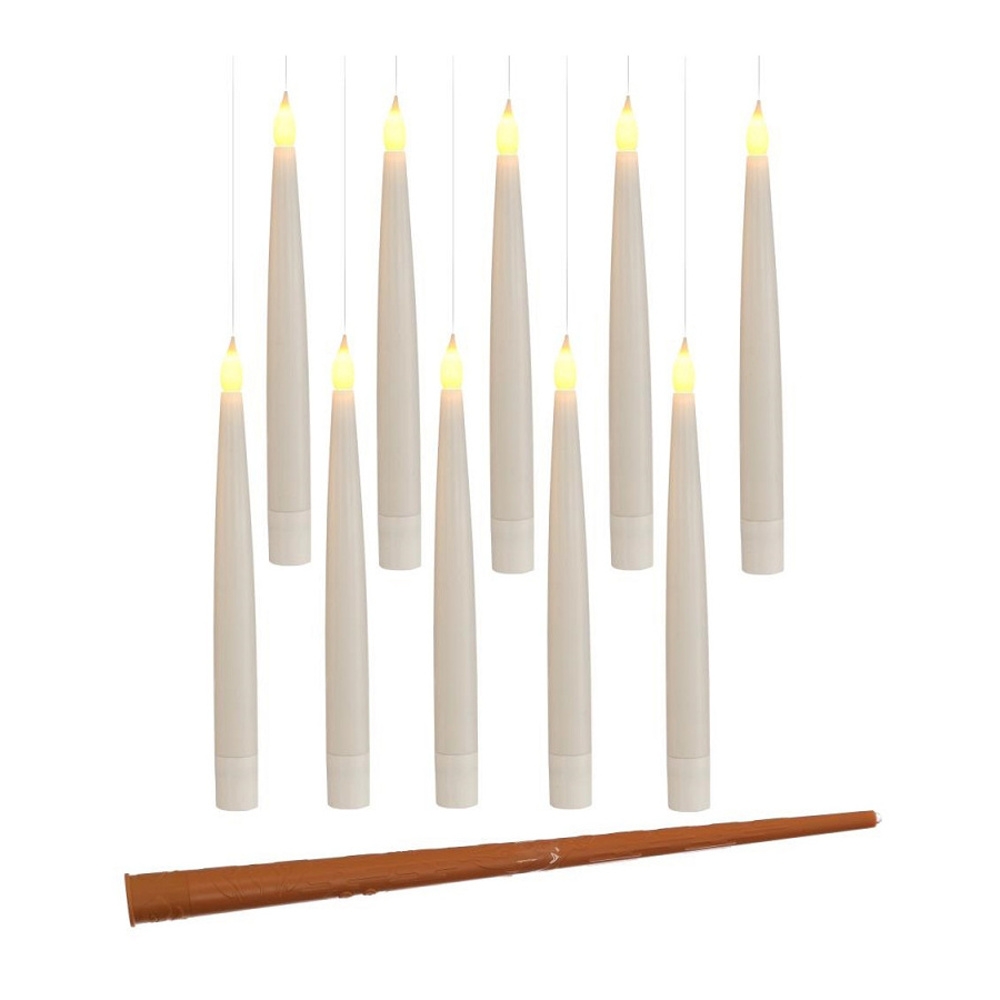 Vytvořte si doma kouzelnou pohádkovou atmosféru s touto sadou levitujících LED svíček a kouzelnou hůlkou! Dvanáct kónických svíček s teplým bílým světlem působí dojmem, že se vznášejí ve vzduchu. Jsou ideální pro vánoční výzdobu, večírky, svatby nebo tematické dekorace. Každá svíčka je vybavena LED diodou, časovačem na 6 hodin a funguje na baterie, takže nepotřebujete žádné kabely. Součástí balení je také dálkový ovladač, kterým můžete svíčky pohodlně zapínat, vypínat nebo měnit režimy svícení.