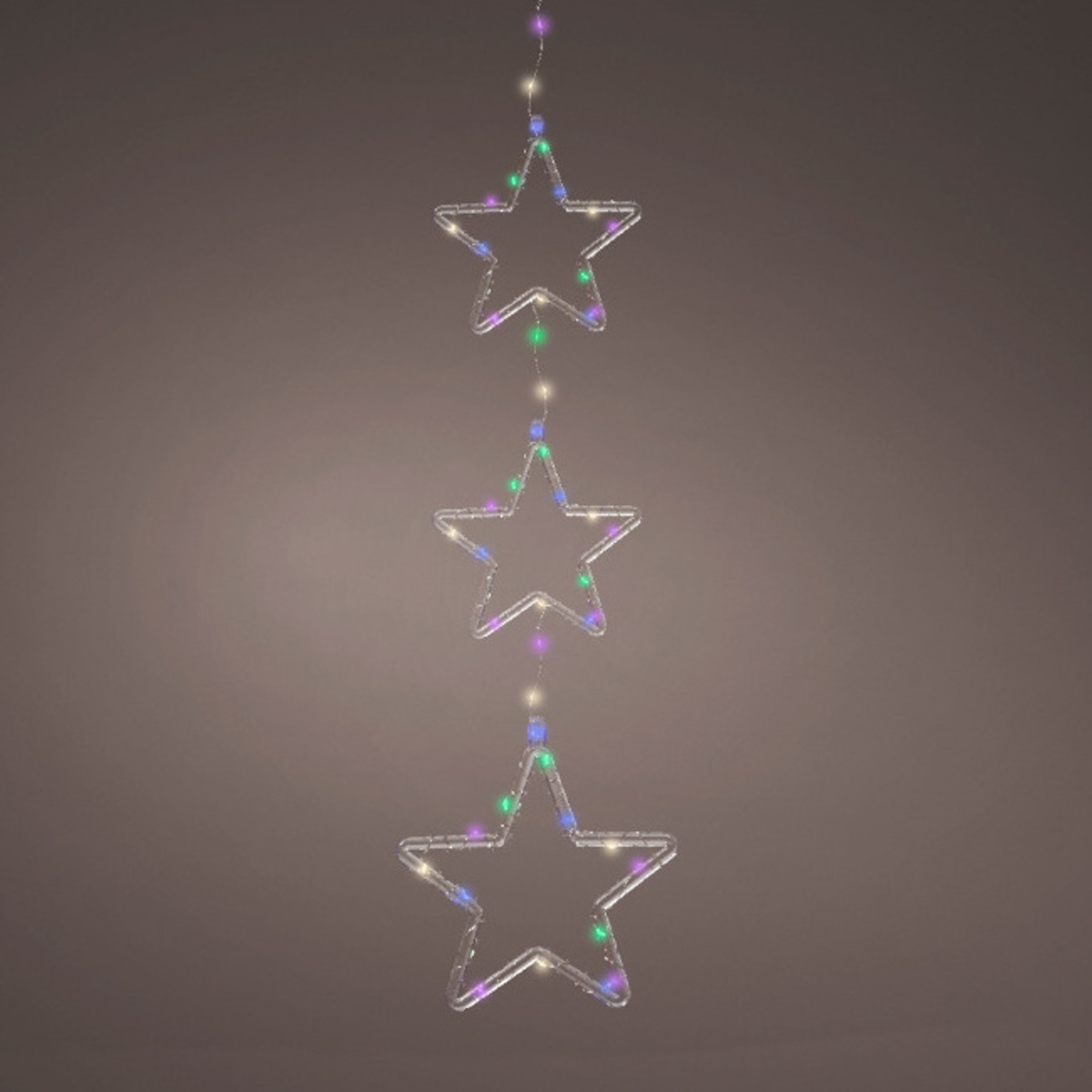 Rozjasněte svůj domov či zahradu kouzelnou dekorací tří svítících hvězd s barevným LED osvětlením. Dekorace je vysoká 58 cm a osazena 48 microLED diodami, které září v různých barvách a dodají prostoru veselou a sváteční atmosféru. Díky praktickému časovači a napájení na baterie je možné hvězdy snadno umístit kamkoliv bez nutnosti připojení k elektrické síti. Jsou vhodné pro interiér i exteriér, takže ozdobí nejen obývací pokoj, ale i zahradu či balkon.