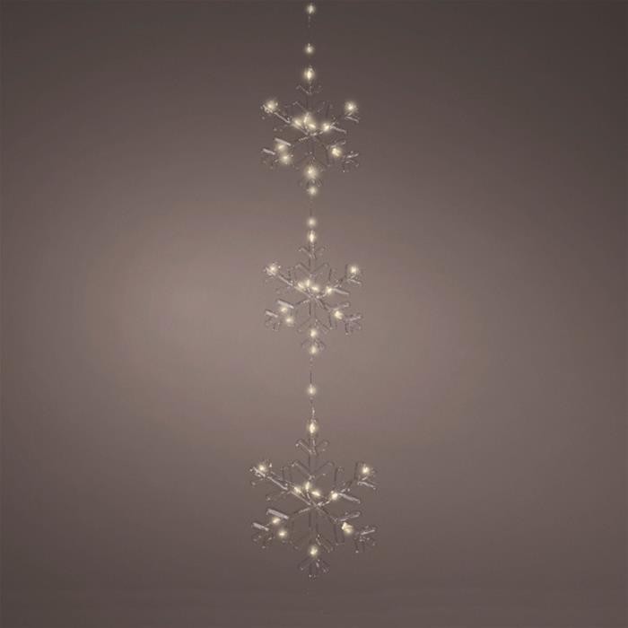 Kouzelná vánoční dekorace v podobě tří zavěšených vloček, které zkrášlí váš domov i zahradu. Díky 44 teple bílým microLED diodám vyniknou jejich jemné tvary a vytvoří nádhernou zimní atmosféru. Dekorace je napájena na baterie, takže ji můžete umístit téměř kamkoli – bez nutnosti připojení k elektrické síti. Praktický časovač zajistí, že se vločky budou samy pravidelně rozsvěcet, což šetří čas i energii.