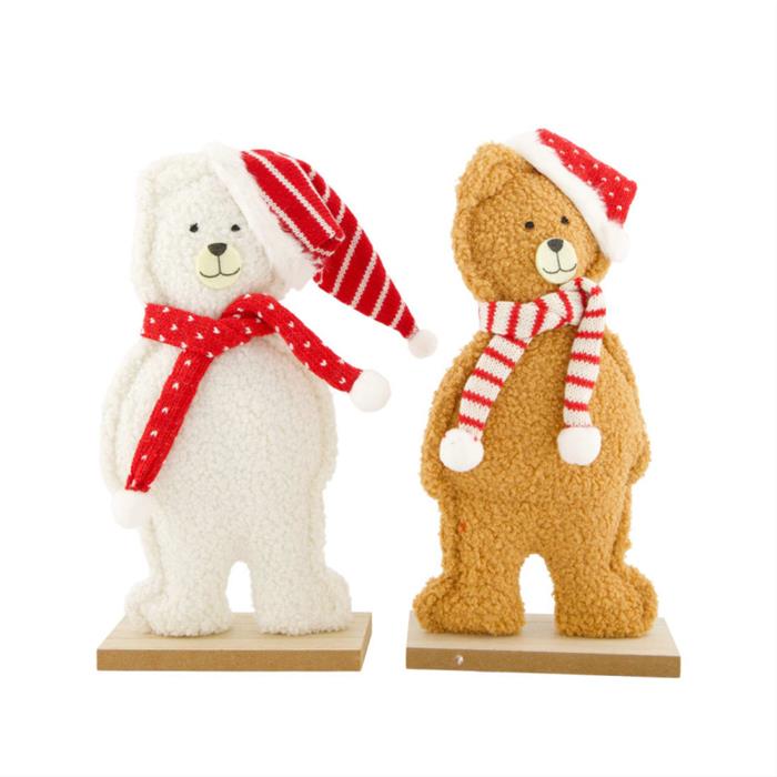Medvěd stojící plyšový s čepicí a šálou na dřevěném podstavci bílý/hnědý mix 49cm
