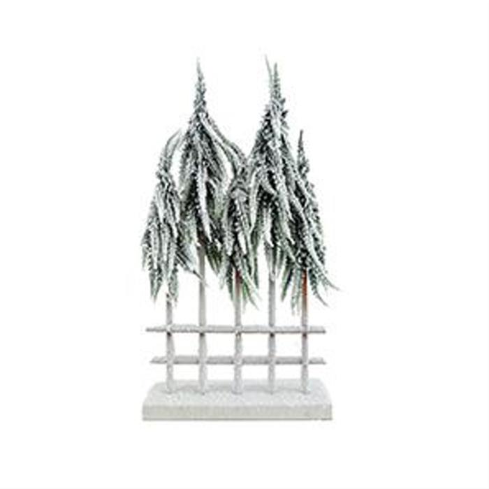 Tato detailně zpracovaná zimní dekorace znázorňuje zasněžené stromy a plot na pevném podstavci. S rozměry 48 × 25 cm je ideální jako výrazný středový prvek na stůl, komodu, okenní parapet nebo do výlohy.