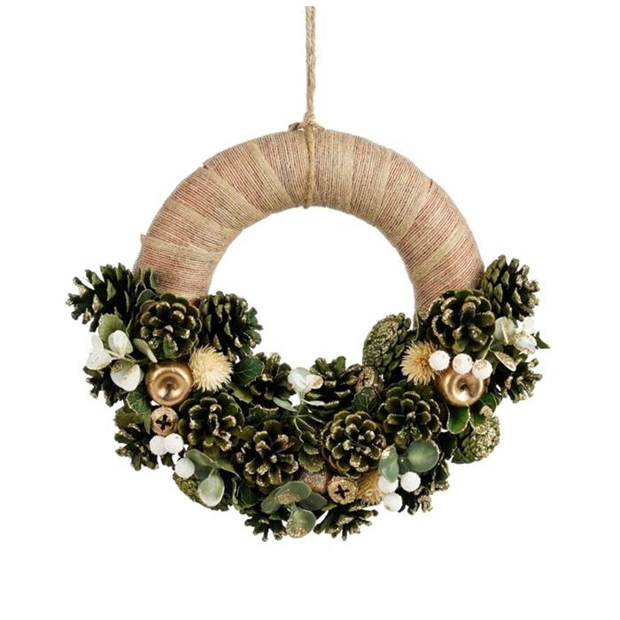 Věnec GEORGIE šišky/bobule/jablka/juta zeleno-zlatý 34cm