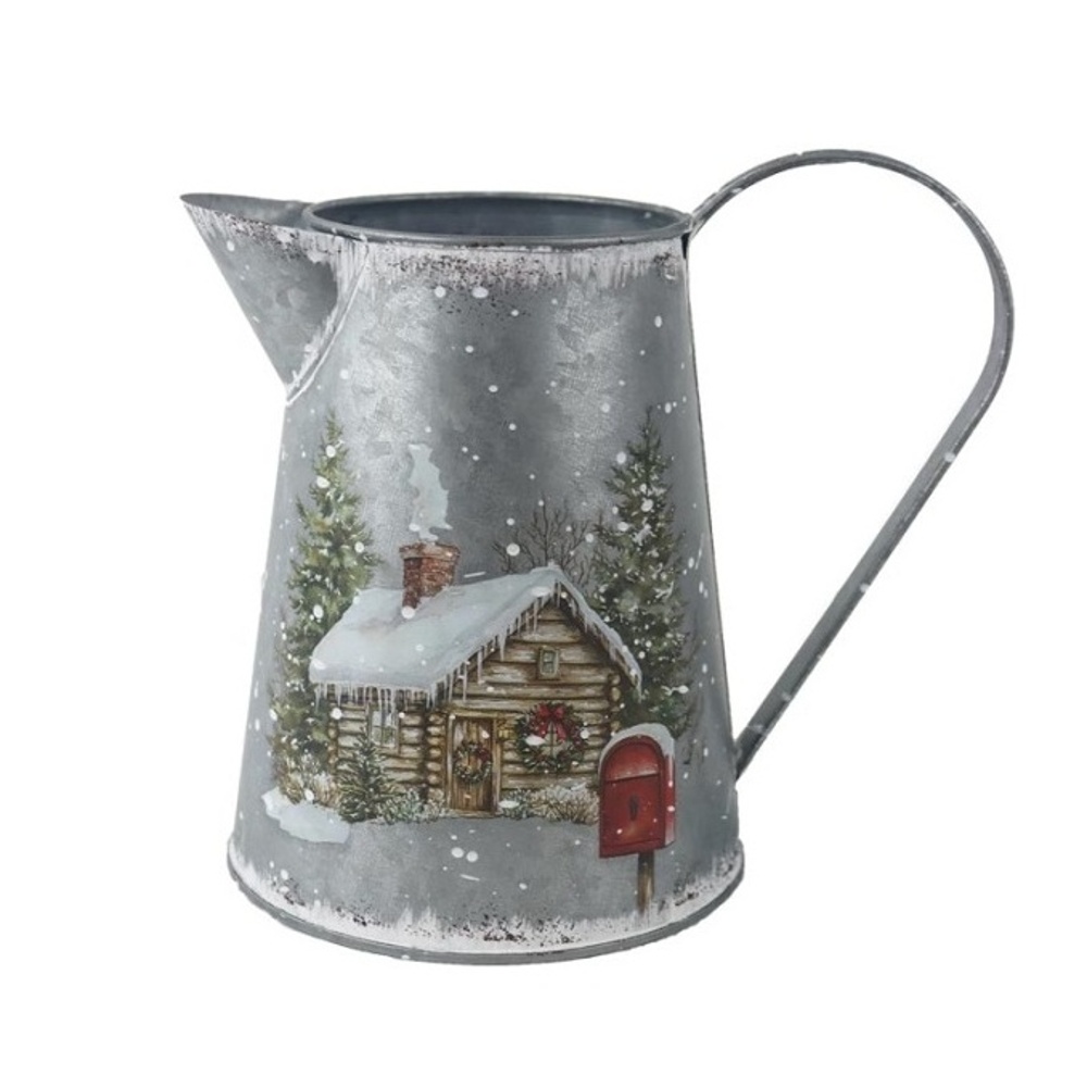 Tento kovový džbán s jedním uchem je nejen praktickým, ale i krásně stylovým kouskem zimní výzdoby. Na jeho přední straně se nachází detailní ilustrace zasněžené chalupy obklopené stromy, s červenou poštovní schránkou v popředí – jako vystřižená z vánoční pohlednice.
