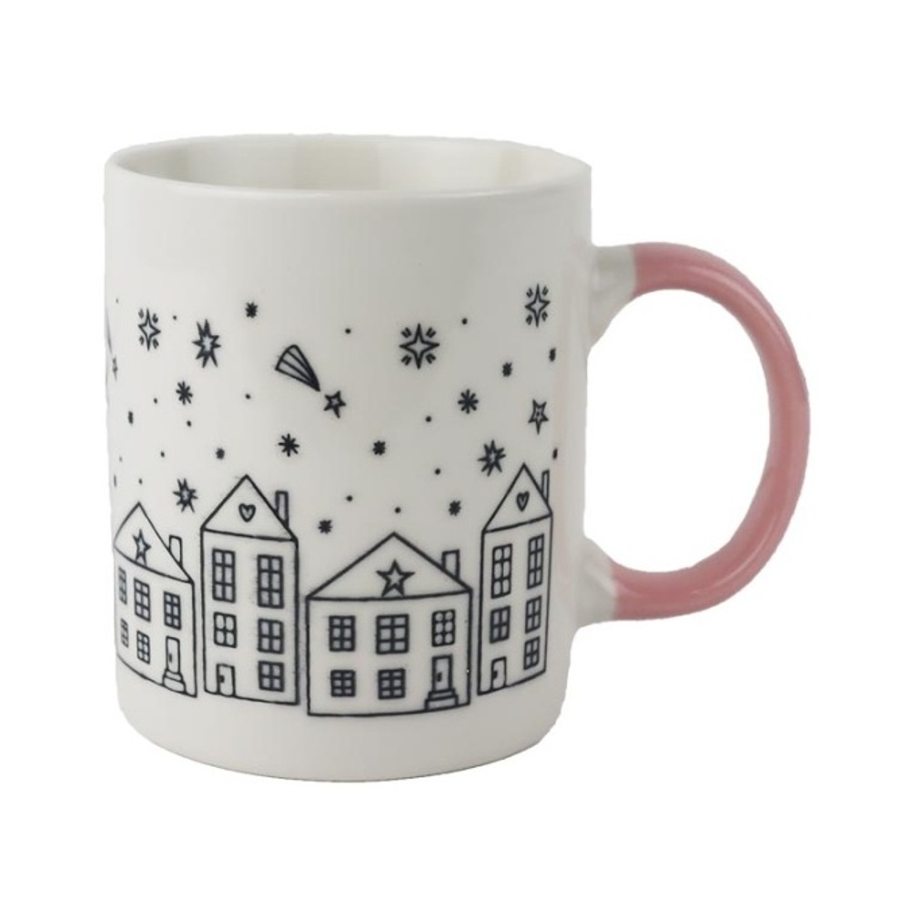 Hrnek porcelánový s domy a noční oblouhou růžovo-bílý