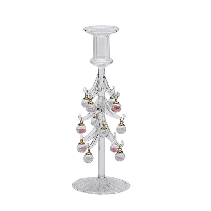 Skleněný svícen se stromkem na noze a ozdobami na 1 svíčku 24,5cm