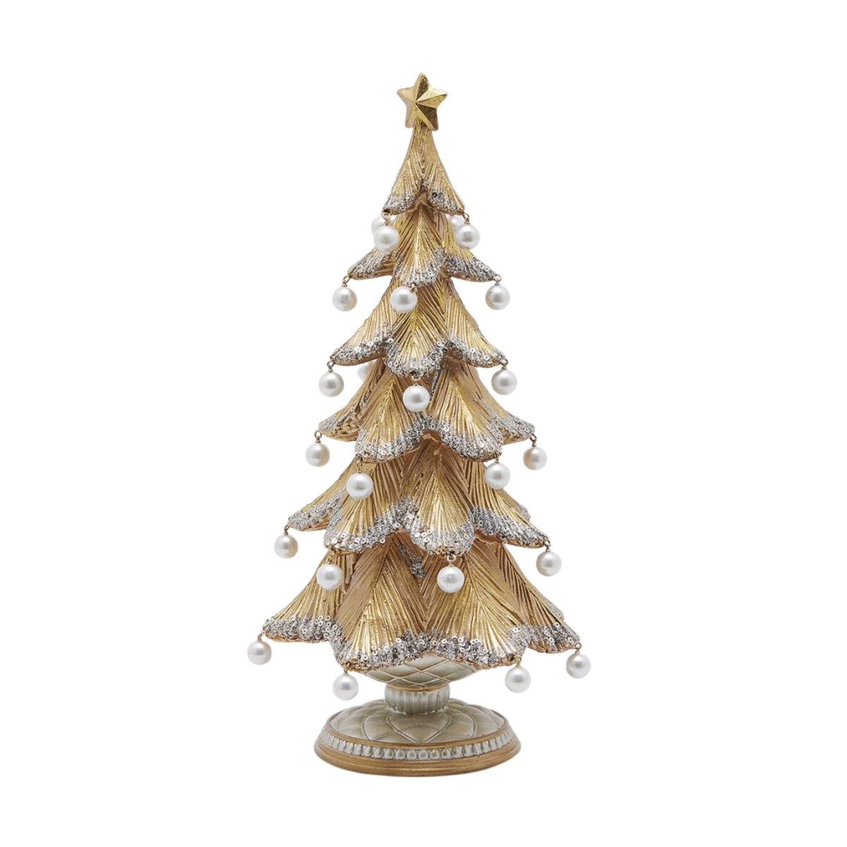 Elegantní vánoční stromek z polyresinu na pevném podstavci je ozdoben hvězdou na špičce a dekorativními bílými ozdobami, které dodávají dekoraci pohádkový a slavnostní vzhled. Vyroben z odolného polyresinu, strom je stabilní a odolný, s precizně propracovanými detaily. Skvěle se hodí jako samostatná dekorace nebo součást tematického vánočního aranžmá.
