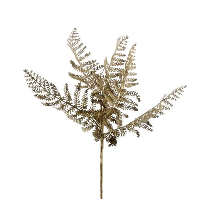 Elegantní umělé kapradí v trsu světle zlaté barvy, vysoké 33 cm, je ideální dekorací pro váš domov či kancelář. Díky realistickému vzhledu a decentnímu třpytu přináší do prostoru příjemnou atmosféru bez potřeby údržby.