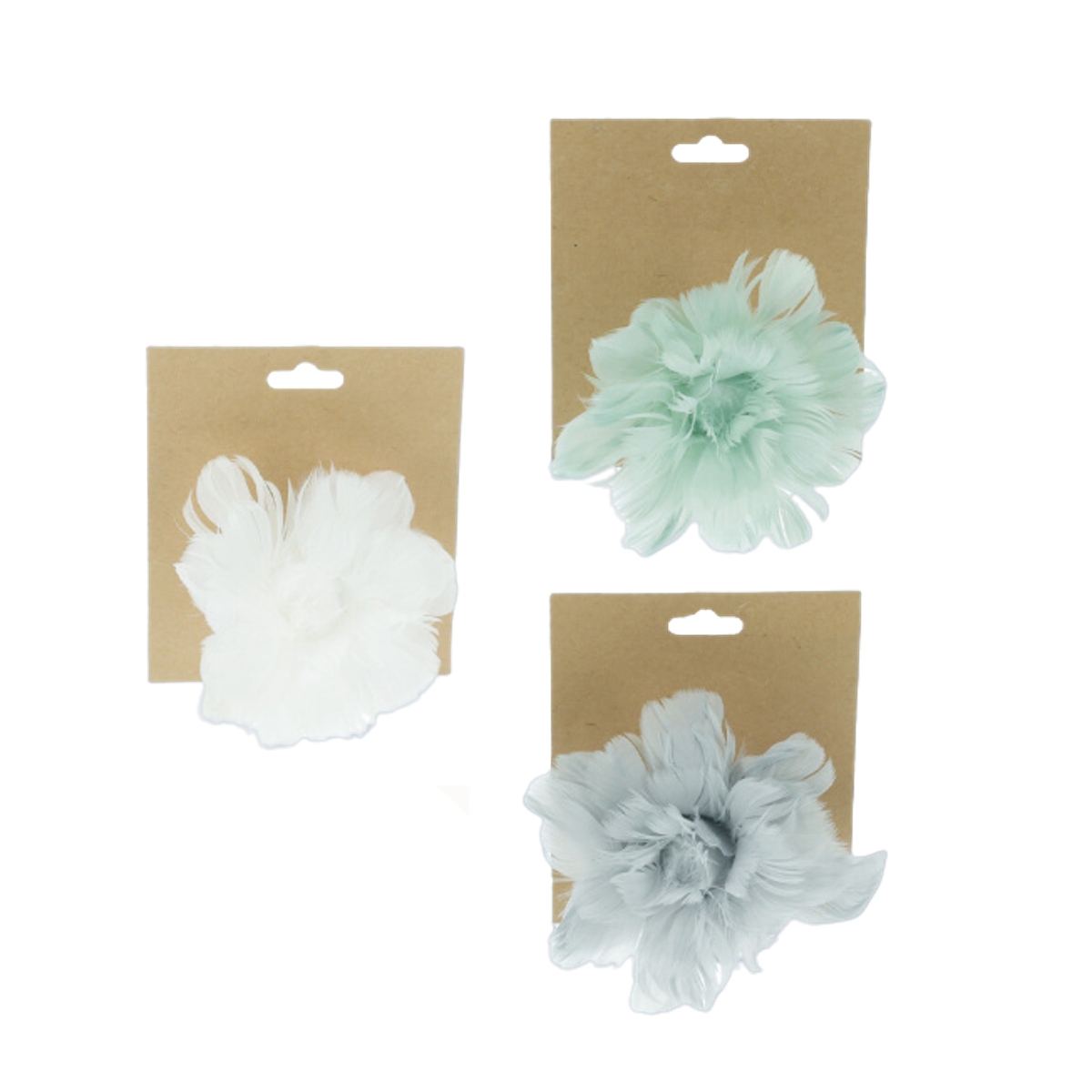 Luxusní dekorativní květ z jemného peří je uchycen na praktickém klipu, díky kterému jej snadno připevníte na vánoční stromek, věnec, girlandu nebo jinou dekoraci. Barevný mix (bílá, světle zelená, šedá) působí elegantně a dodá vašemu interiéru sváteční i celoroční kouzlo. Květ v mixu provedení. Pokud si přejete konkrétní variantu, napište ji do poznámky, pokusíme se vyhovět. V případě nedostupnosti bude odeslán náhodný kus.