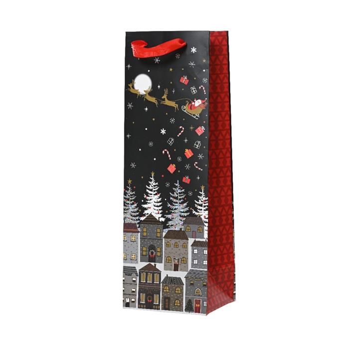 Popis produktu Taška dárková na lahev papírová se Santou v saních černo-červená 36cm