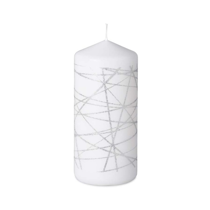 Dekorační válcová svíčka. UPOZORNĚNÍ: Přihoření nenechávejte svíčku bez dozoru a vždy ji umístěte na nehořlavou podložku.