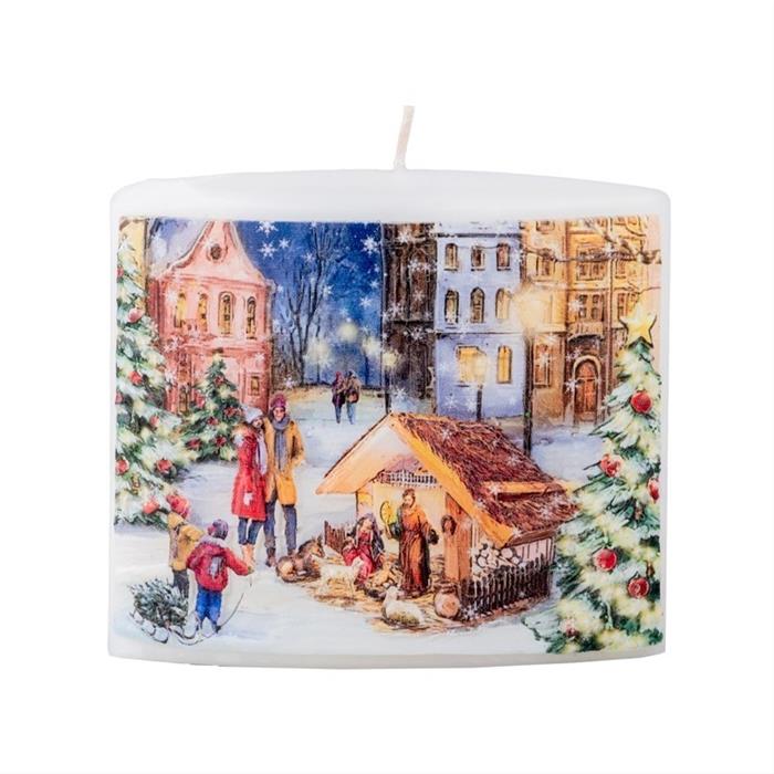 Elipsová svíčka 10 cm s jemným motivem Betléma. Vytvoří v domově poklidnou a sváteční atmosféru Vánoc. Svíčka vhodná pro tvorbu aranží či dekorací. UPOZORNĚNÍ: Při hoření nenechávejte svíčku bez dozoru a vždy ji umístěte na nehořlavou podložku.