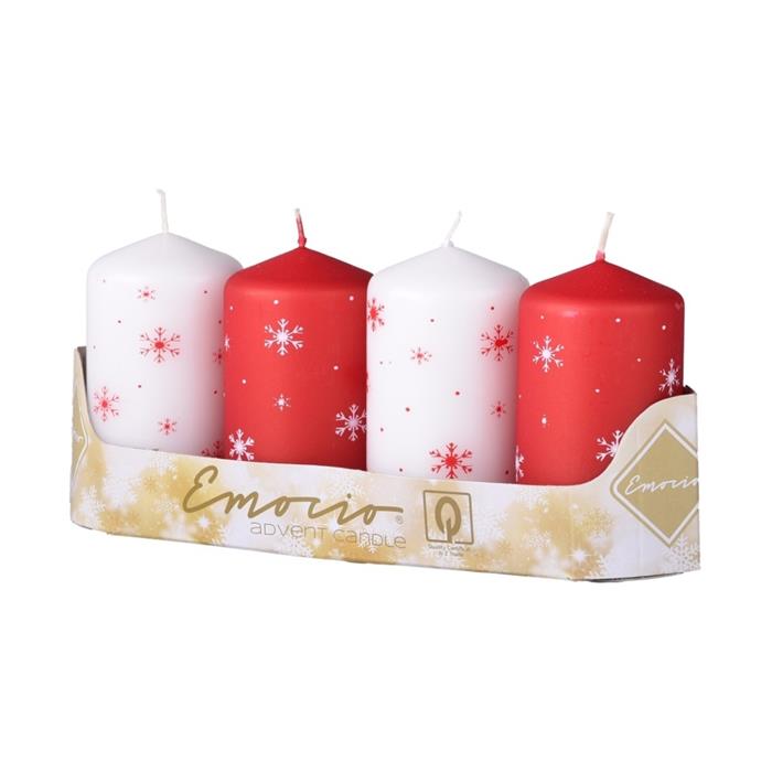 Svíčka válcová s vločkami bílá/červená 9cm/4ks