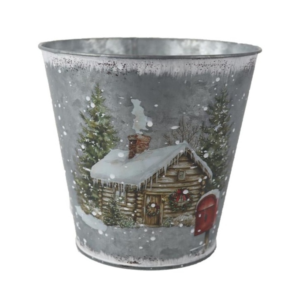 Stylový kulatý obal vyrobený z kvalitního plechu s jemným zimním motivem domu v zasněžené krajině. Ideální jako dekorativní doplněk, který přinese do vašeho domova kouzlo zimních svátků.