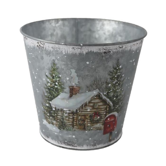 Stylový kulatý obal vyrobený z kvalitního plechu s jemným zimním motivem domu v zasněžené krajině. Ideální jako dekorativní doplněk, který přinese do vašeho domova kouzlo zimních svátků.
