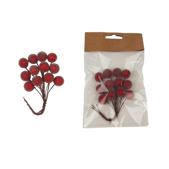 Přízdoba ojíněná bobule na drátku umělá červená 1,5cm/12ks