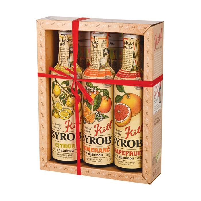 Dárková kazeta sirupů Kitl z citrusů obsahující Kitl Syrob Pomeranč, Citron a oblíbený Grapefruit. Tyto sirupy jsou ideální na osvěžující koktejly a domácí limonády.