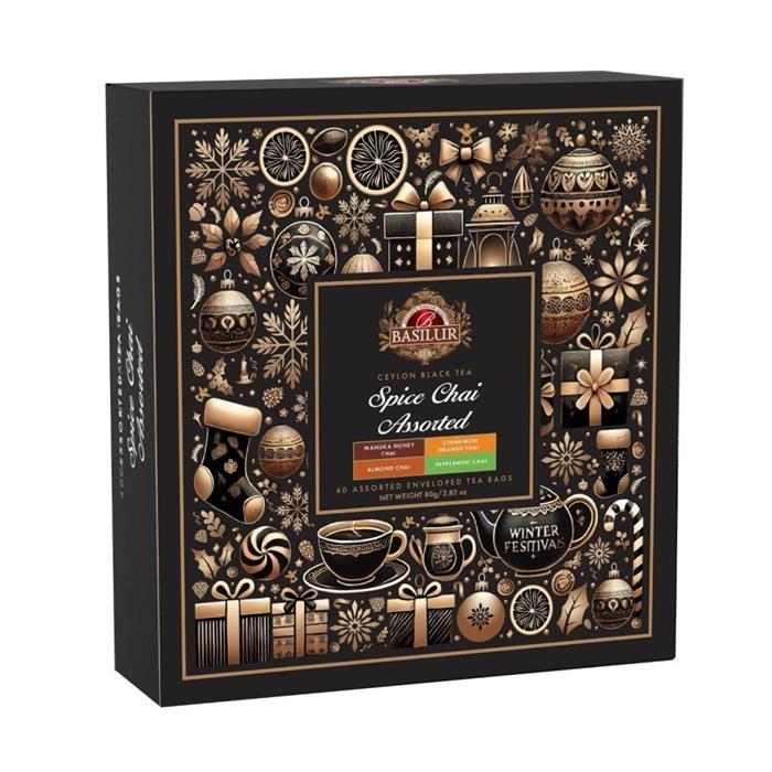 Složení: Manuka Honey - černý čaj, aroma (chai, med Manuka), Peppermint - černý čaj 83,5 %, máta peprná list 10 %, aroma (chai, máta), Almond - černý čaj, aroma (chai, mandle), Cinnamon Orange - černý čaj 79,5 %, skořice 15 %, aroma (chai, pomeranč).