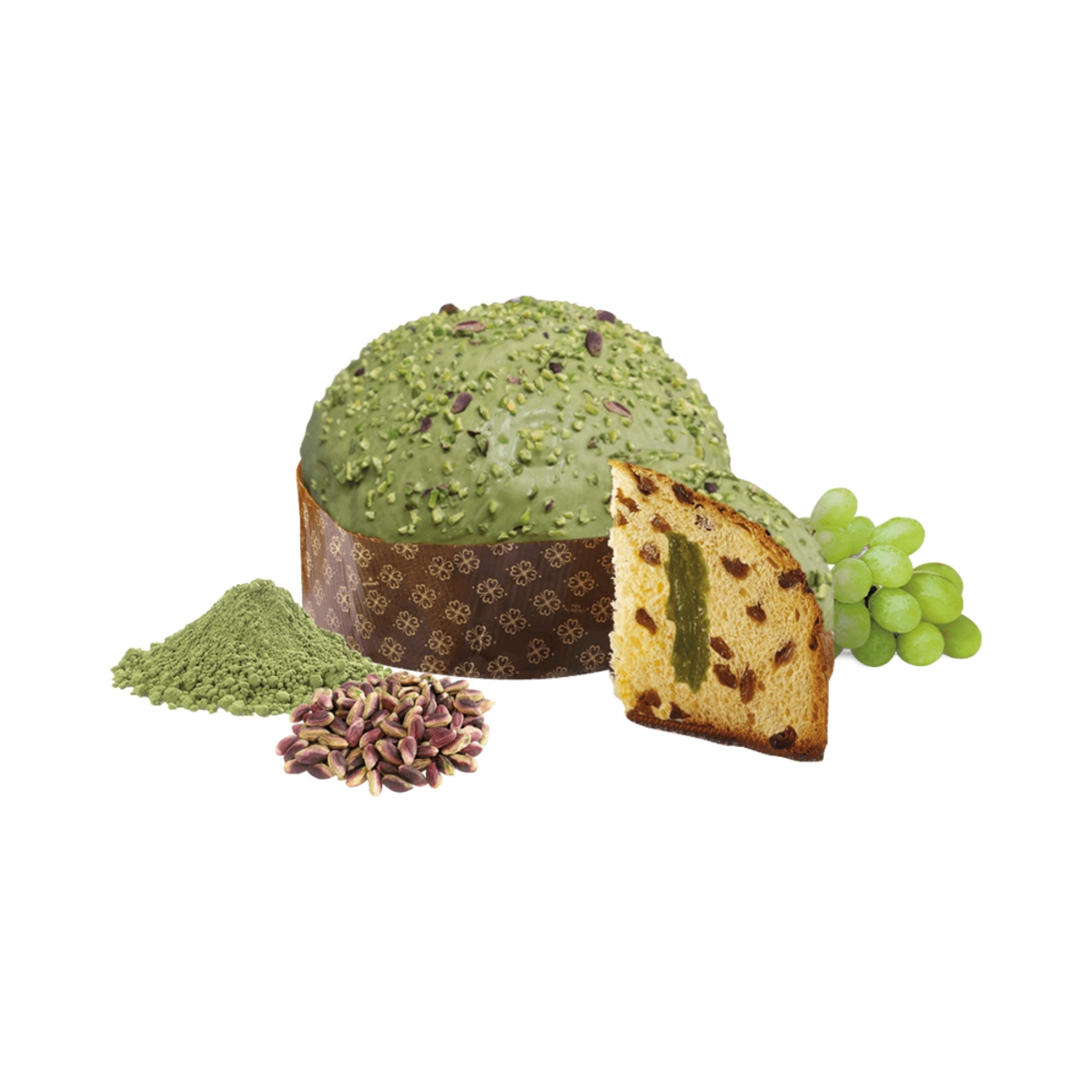Složení: pšeničná mouka, smetana s Pistachino Verde di Bronte (14%) [glukózový sirup, cukr, pasta Pistachino Verde di Bronte (14%), cukr, voda, máslo, vaječný žloutek, ethylalkohol, Sušené odstředěné mléko, přírodní příchutě, zahušťovadlo: modifikovaný kukuřičný škrob, zelený čaj Matcha (1%), sůl, želírující látka: pektin, emulgátor: mono- a diglyceridy rostlinného původu mastné kyseliny], rozinky sultánky (13 %), čerstvá vejce z volného chovu v Itálii, bílá čokoláda (10 %) - [cukr, kakaové máslo, sušené mléko, emulgátor: sójový lecitin, přírodní vanilkové aroma], čerstvé máslo (9%), cukr, přírodní kváskové droždí (pšenice), čerstvý vaječný žloutek z volného chovu v Itálii, Emulgátor: mono- a diglyceridy mastných kyselin rostlinného původu, květový medze Sicílie, Pistachino Verde di Bronte celé a v zrnech v různém poměru (2 %), Cervia celá mořská sůl, kakaové máslo, přírodní vanilka Mananara z Madagaskaru (0,2 %), přírodní aroma. OBSAHUJE: pšenici, vejce, mléko a může obsahovat stopy sóji a ostatních druhů ořechů.