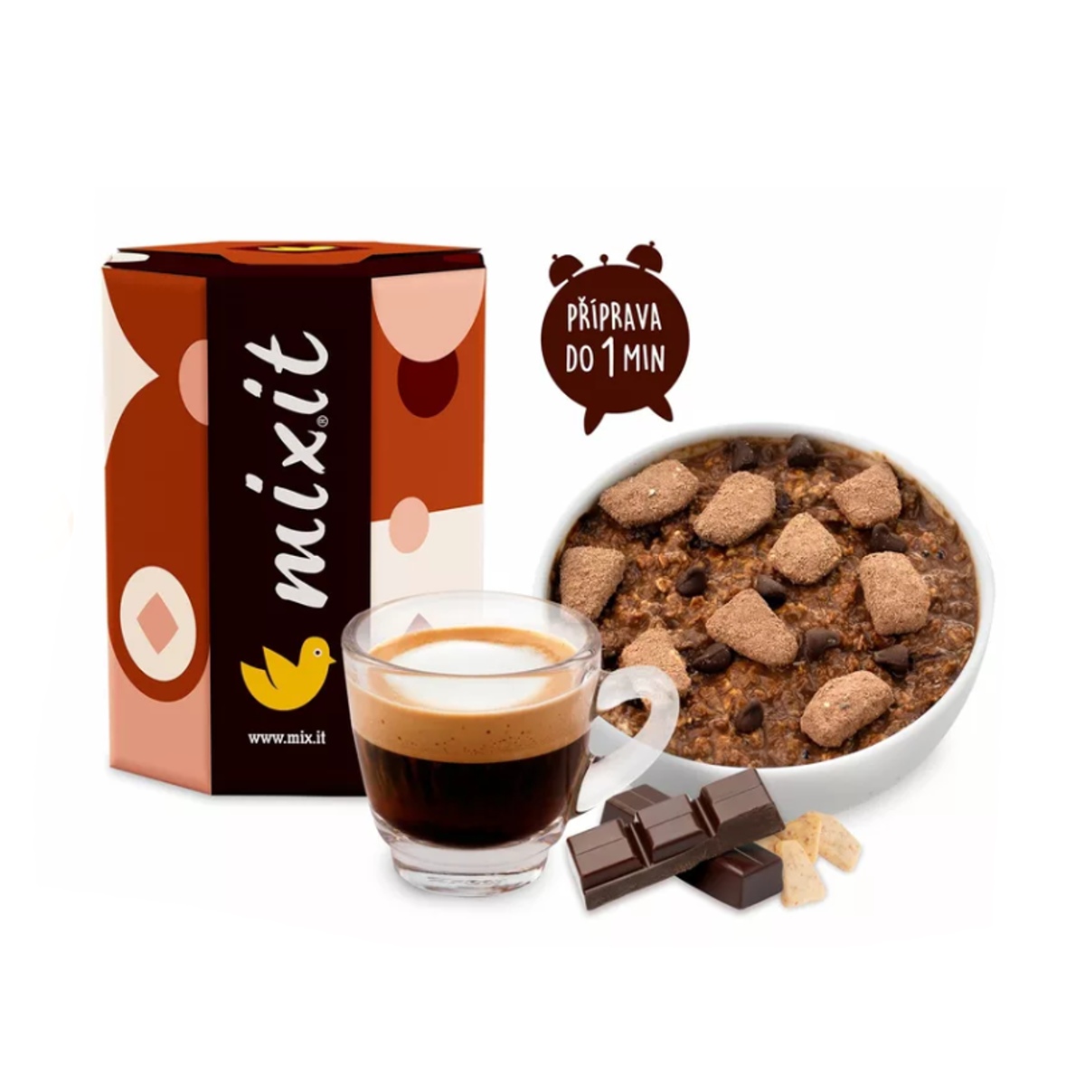 Když se oblíbená Minutová ovesná kaše nechá inspirovat tradičním italským dezertem, vznikne snídaně, do které se zamilujete na první ochutnání. Stačí zalít horkou vodou či mlékem, promíchat a za minutku máte hotovou krémovou kaši plnou jemných ovesných vloček, sušenek, kousků hořké čokolády, kakaa a nádechu kávy. Chia semínka a porce syrovátkového proteinu se postarají o to, že kaše zasytí a dodá bílkoviny, zatímco použitá káva bez kofeinu zajistí, že si ji můžete dopřát kdykoliv během dne – klidně i jako dezert.