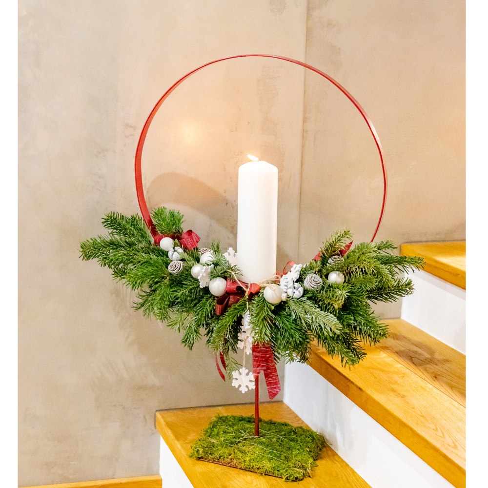 Kovový svícen na podstavci. Úprava materiálu: před lakováním povrchu probíhá tryskání ocelových broků a automatické odmaštění/fosfátování, poté lakování v práškové lakovně a následně vypalování při cca 200 °C po dobu cca 20 minut. Výsledkem je hladká, antikorozní barva.