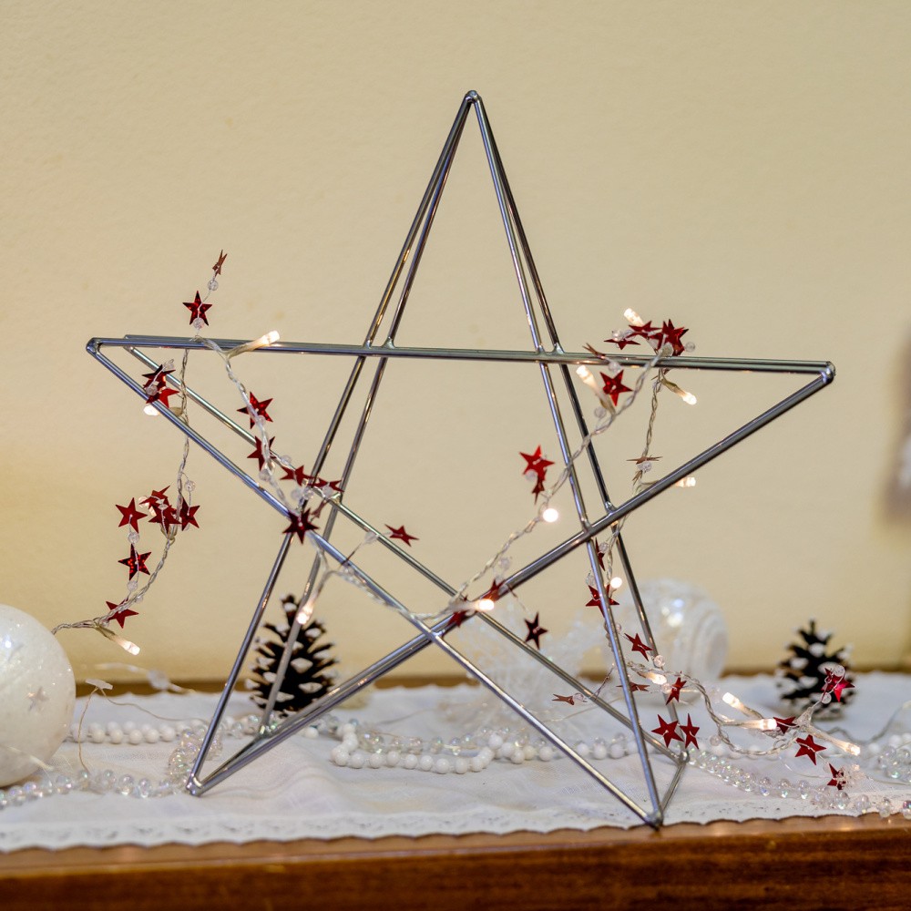 Kovová dekorace ve tvaru hvězdy.Úprava materiálu: před lakováním povrchu probíhá tryskání ocelových broků a automatické odmaštění/fosfátování, poté lakování v práškové lakovně a následně vypalování při cca 200 °C po dobu cca 20 minut. Výsledkem je hladká, antikorozní barva a celoroční užívání na zahradě.