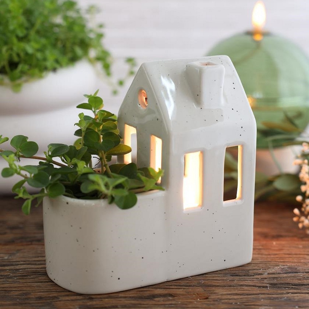 Kouzelný keramický domek 2v1 poslouží jako obal na květináč i stylový svícen. Je vyroben z kvalitní keramiky v elegantní krémové barvě, která snadno zapadne do jakéhokoli interiéru. Díky svému univerzálnímu designu můžete dovnitř umístit malou rostlinu, sukulent nebo čajovou svíčku jejíž světlo pak krásně prosvítá okénky domku a vytváří útulnou atmosféru.
