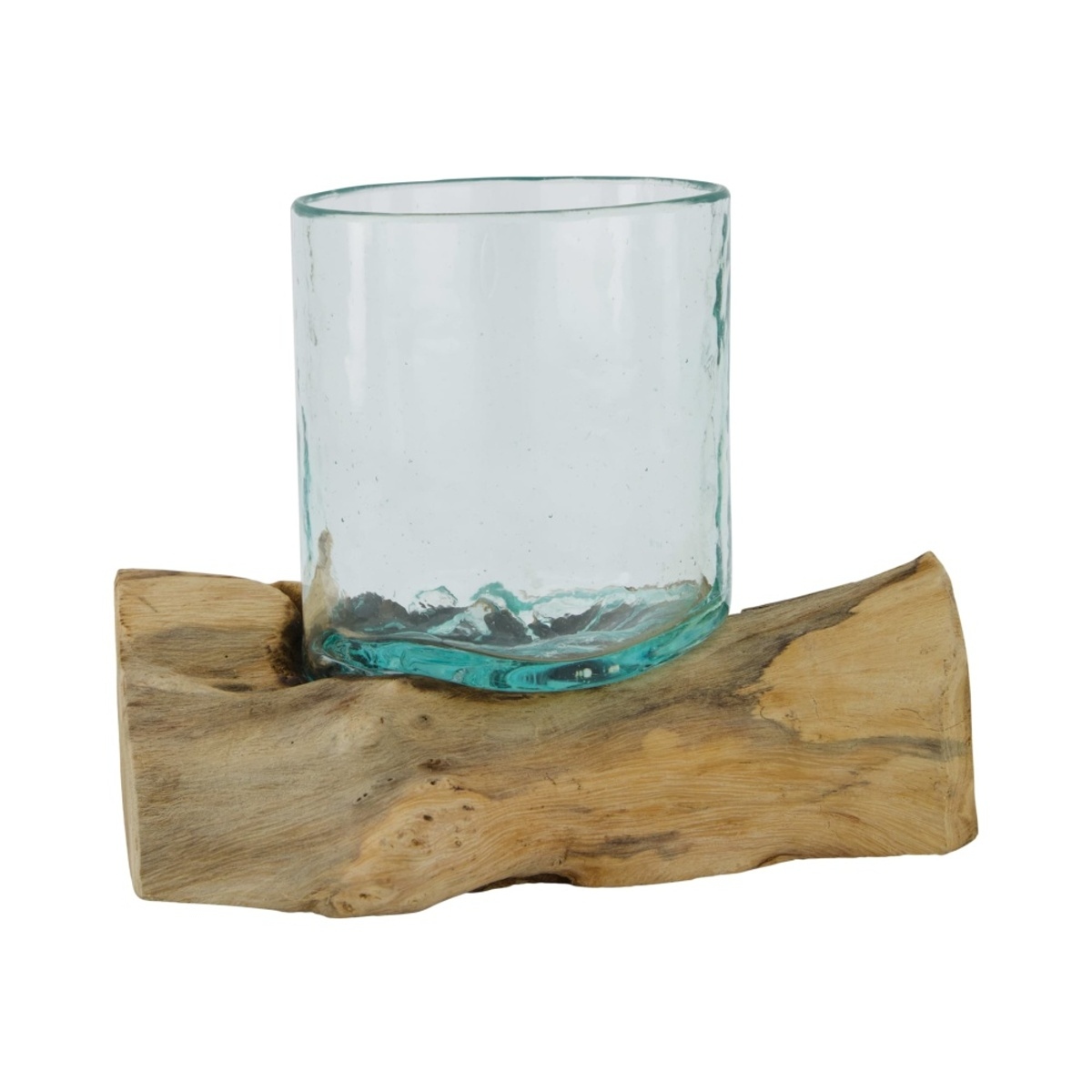 Vneste do svého interiéru jedinečný kus přírody s touto stylovou vázou z ručně foukaného skla usazenou na masivním dřevěném podstavci. Každý kus je originál – tvar skla se přirozeně přizpůsobuje nepravidelnostem dřeva, čímž vzniká naprosto unikátní kombinace.