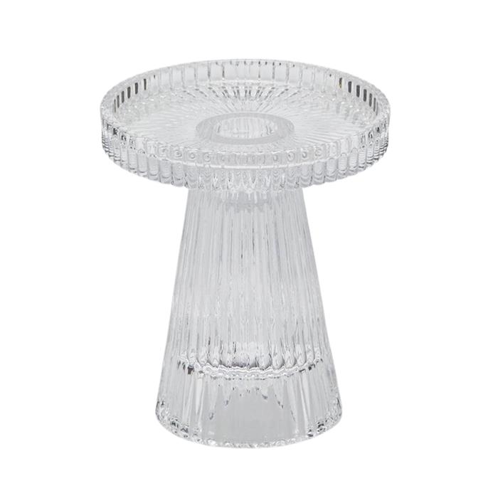 Elegantní skleněný svícen, který zaujme svým jemně rýhovaným povrchem zvýšenou nožkou. Díky průzračnému sklu krásně rozptyluje světlo svíčky a vytváří útulnou atmosféru v každém interiéru. Tento svícen se hodí pro kónické svíčky. Skvěle doplní svatební tabuli, vánoční dekoraci nebo romantické večery.
